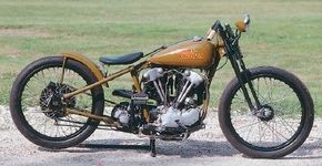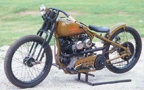 Board-track racing (so named because the oval tracks were made of wooden planks) was popular in the early days of motorcycling as a test of both speed and endurance. To build this replica of a 1930s board-track racer, Williams started with a Harley-Davidson Knucklehead engine that he bored out and fitted with a high-performance cam and dual carburetors. A 1931 Harley VL model donated its frame, which had to be stretched by an inch to fit the larger engine. (The VL came with a flathead V-twin, which is more compact-but far less powerful-than the overhead-valve Knucklehead.)