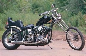 A two-into-one header from Cycle Shack helps the old engine breathe. Power routes to a stock Harley spoke wheel with drum brake; in front, a Hallcraft 21-inch spoke wheel with disc brake was chosen for more of a "chopper" look.