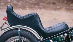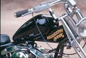 The fuel tank is set back on the frame's top tube, allowing space for a graphics panel carrying the bike's Mississippi Queen moniker. A set of nearly flat drag bars in tandem with a deeply contoured "King and Queen" seat add an appropriate look to a bike built in the Early Chopper style -- which was something never offered by the folks from Milwaukee.
