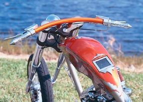 The Spoon rides a hardtail chassis carrying a 100-cubic-inch Harley-Davidson engine fitted with Rev Tech internal hardware. Among the bike's unusual features is a rearview camera and video screen that substitute for rearview mirrors -- eliminating their often tacked-on look -- while allowing the rider a clear view of what he's leaving behind.