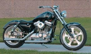 A new swingarm on the Sportster allowed use of a wide 180-mm rear tire and a fender from the Jesse James catalog, which also supplied the front fender. The fuel tank was stretched, and revised triple trees gave the forks an extra five degrees of rake. All this resulted in a bike that looks longer and lower than a stock Sportster.