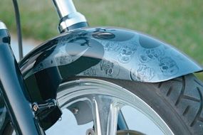 Further touches on the Sportster include a set of Performance Machine wheels, a digital gauge cluster, and "chopper style" headlight and taillight. Topping it all off is a metallic blue paint job highlighted with tribal flames hiding ghosted skulls.