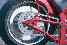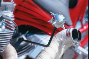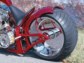 As the name implies, Suicide Softail features a uniquely styled rear swingarm with adjustable air-spring suspension mounted behind the engine. And what an engine it is: 145 cubic inches of V-twin power, with custom-bent exhaust pipes wrapped in heat-shielding tape. A 6-speed Baker transmission with hand shifter feeds the ponies to a combination sprocket/rear brake affixed to a solid, chromed rear wheel.